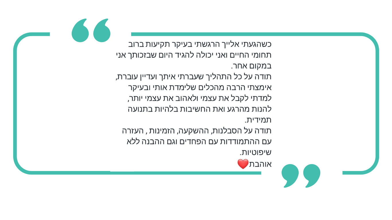 אם נאלצת להחסיר מפגש, תקבלי סיכום והכוונה להמשך.
